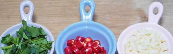 2、 泡椒、小米椒切碎、大蒜切末;香菜切段。