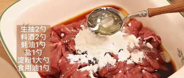 1、 牛肉清洗干净,切成大小均匀的薄片,放入盐、生抽、蚝油、料酒、淀粉、食用油,用手抓拌均匀、腌制10分钟。