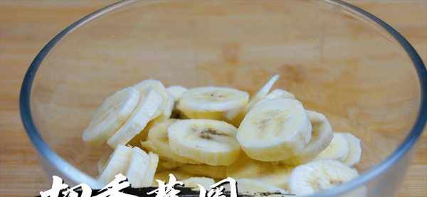 剥好皮的香蕉全部放置到案板上,用刀将香蕉切成香蕉片,可以看到香蕉非常新鲜,时尚度也很适中,这样的香蕉最好吃,不过于软烂,也不会因为生而夹嘴。把香蕉切得跟图片这样薄厚适中就可以了。香蕉全部切好之后,将它装入一个干净的碗中备用。