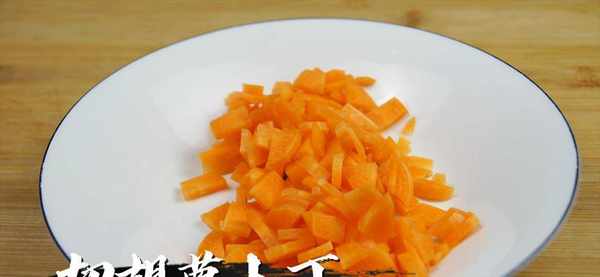 然后拿出一根准备好的胡萝卜,这个胡萝卜我们尽量选用比较美一些的胡萝卜,然后可以不去皮就能使用。将胡萝卜用清水清洗干净之后,放置案板上,用刀将胡萝卜从中间切开,一分为二,然后再将胡萝卜切成条,之后再将胡萝卜条改刀切成小片就可以了。切好装盘备用。