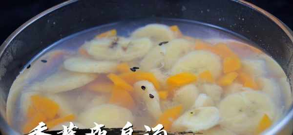 我们可以找来一个干净的小碗,先将锅中的香蕉片和胡萝卜片盛入碗中,然后再用汤勺往碗里加入两到三勺汤水,在食用之前可以再往碗中撒上少许的黑芝麻,这里一定要记住,撒进去的一定要是熟的黑芝麻哦。由于黑芝麻它的热量比较高,所以一次不宜食用太多,再加上食用这汤的小伙伴是要漂亮的,那就更不能多食用这个黑芝麻了。只要适量地撒入一点点,大概20粒左右就可以了,食用之前用汤勺轻轻地搅拌几下,然后再食用。