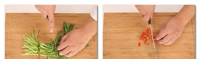 1、茼蒿洗净,切成段,蒜切片,红尖椒切成小圈。