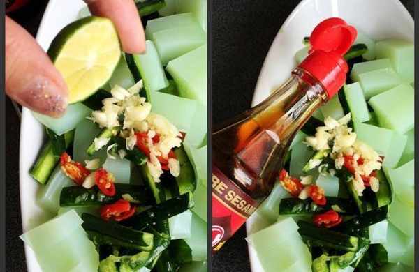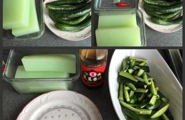 材料:小黄瓜5条,绿豆凉粉2盒,辣椒适量,蒜3瓣,柠檬2片。