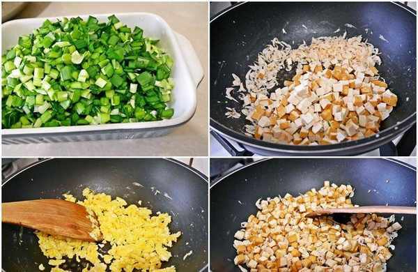 2、起锅烧油,打入鸡蛋,快速搅成蛋花,放入韭菜末中,再把虾皮和豆干丁放进去,加入盐和香油调味,搅拌均匀。