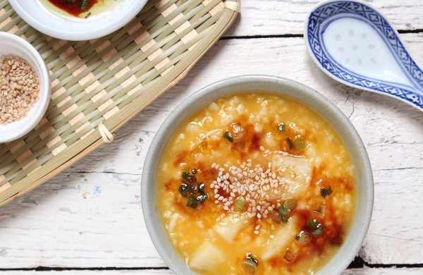 4、粥煮熟后,可加一点点海盐、芝麻和酱料调味,就可以吃了。