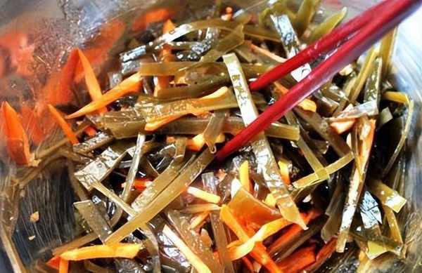 3、将海带丝和胡萝卜丝放入盆中,下入酱汁拌匀,就可以吃了。