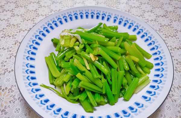 3、起锅烧油,下入辣椒和蒜末爆香,然后下入芹菜,翻炒均匀,再放入盐,糖和蚝油调味,出锅。