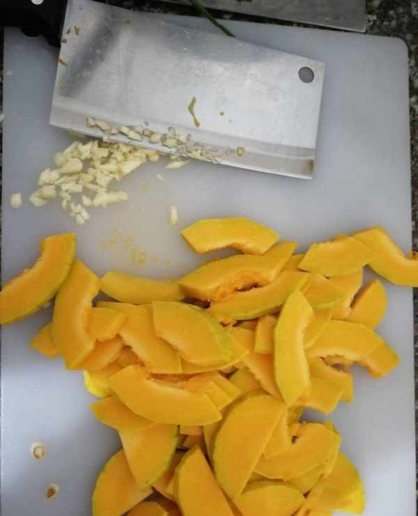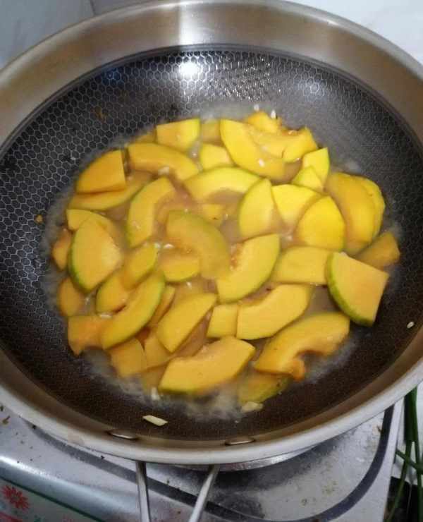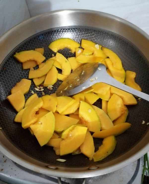 2、起锅烧油,下入蒜末爆香,然后下入南瓜,翻炒30秒。