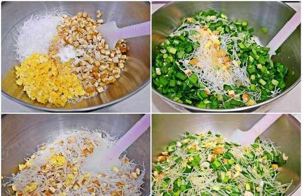 材料:面粉400克,韭菜400克,鸡蛋4个,薄豆干5片,虾皮30克,盐适量,香油适量。