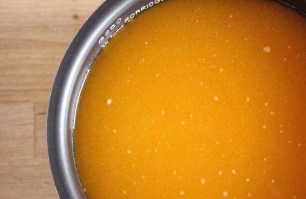 3、将糙米、小米、山药及南瓜泥放入锅里,再倒入开水熬煮。