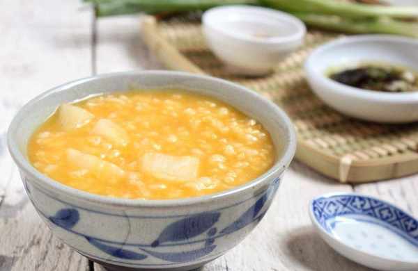 材料:糙米半杯,小米1/4杯,山药1杯,葱1根,芝麻少许,南瓜泥适量,生抽少许,橄榄油适量。