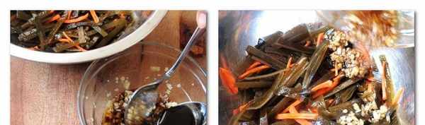 材料:干海带半块,蒜3瓣,胡萝卜半根,白糖半勺,醋1勺,麻油1勺。