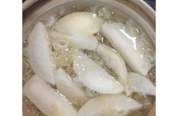 4、再开火,水开后下入雪梨块,小煮一下,下入冰糖,冰糖溶化后关火,出锅。