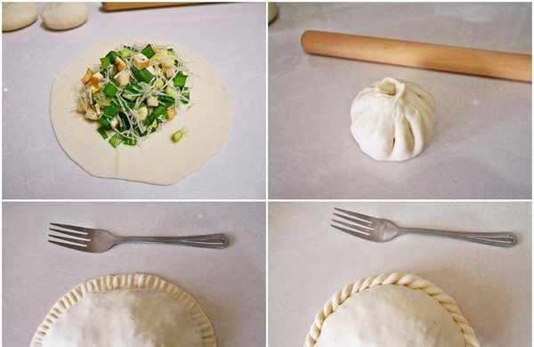 4、将面团切成大小均等的剂子,然后擀成圆形薄片,舀一勺韭菜馅料放在中间,然后两边扯起,包成盒子形状。