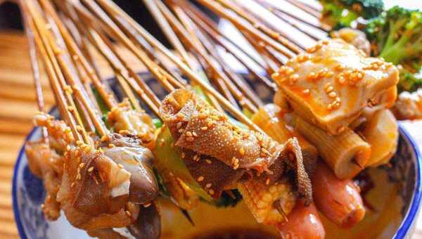 钵钵鸡最好的荤菜并不是牛羊肉,而是鸡肉和鸡下水,经过焯水和浸泡过的鸡内脏,肉质紧实,Q弹入味,每一口都是享受。钵钵鸡不仅颜值高而且气质好,街边的小店会用竹签把食材穿起来,顾客买了之后可以边走边吃,也是很方便。