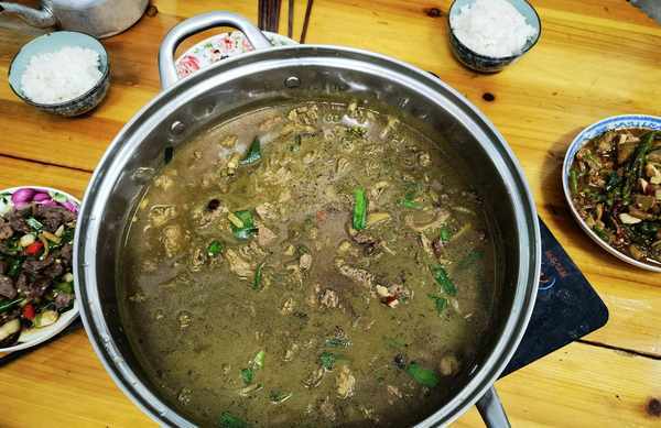 开始吃晚饭了。田老师干脆就不露面,她不喜欢吃牛瘪。我是好奇,想尝试一下。潘老师说:如果今天不尝尝,以后离开这里就吃不到了。