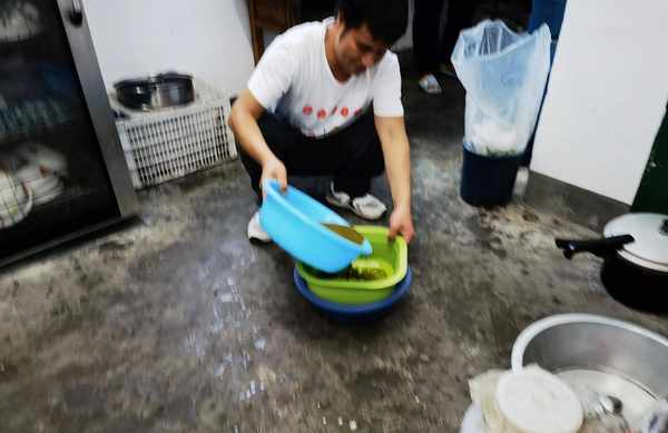 我到厨房时,正好遇见杨老师在用漏盆过滤牛瘪中未消化的青草。此时的牛瘪呈暗绿色浑浊液。