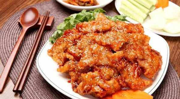 原名锅爆肉,是一道东北菜,成菜后,色泽金黄,口味酸甜。