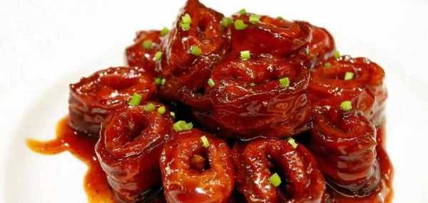 山东的九转大肠,又叫红烧大肠,是山东的一道特色美食,也是当地常见的一道下酒菜。它主要是以猪大肠为主要食材,这是一道功夫菜,以酸甜为主,苦辣咸为辅,口感层次丰富,是一种让你难以忘记的美味。