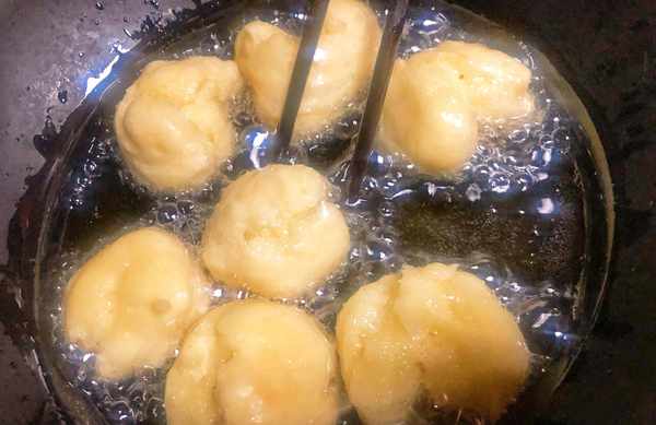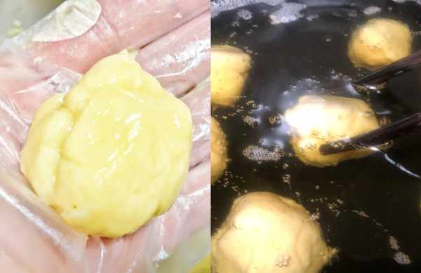 4、为了避免粘手,在炸面团之前最好先在手上抹一层油,这样更容易将面糊团成丸子的形状。