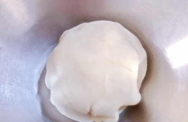 3、面团晾凉以后,分多次加入3个打散的鸡蛋液,加一部分就揉一揉,等面团充分吸收后再继续加,直到将面团揉成有些粘手的面糊即可。