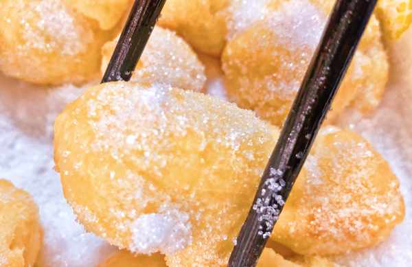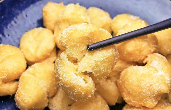 糖沙翁也叫炸蛋球,主要是由面粉和鸡蛋所制成的广式名点,出锅色泽金黄,入口绵软香甜,吃的时候在滚粘上一层粒粒分明的白砂糖,真是比泡芙还好吃,趁热来上一口,简直好吃到吮指。