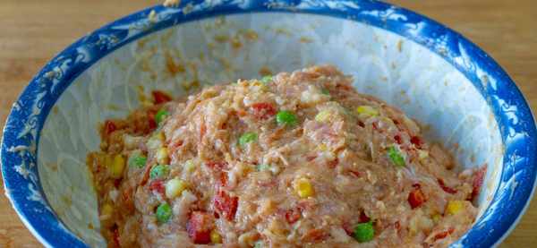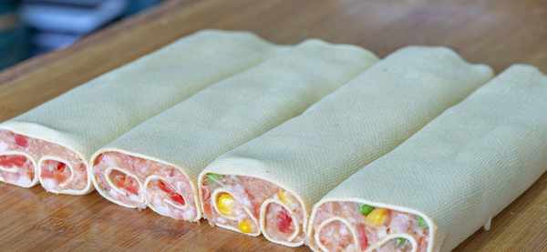 食材:500克猪肉、2块豆腐皮、1个胡萝卜、1个鸡蛋、青豆、玉米粒、生姜、盐 、糖、鸡精 、生抽、料酒 、胡椒粉、淀粉、葱花