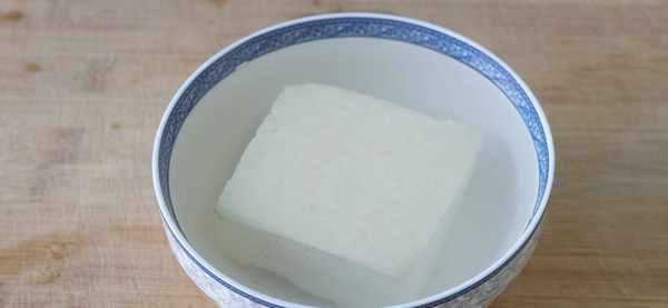 1、准备一块儿豆腐,加开水泡5分钟,去除豆腥味儿。