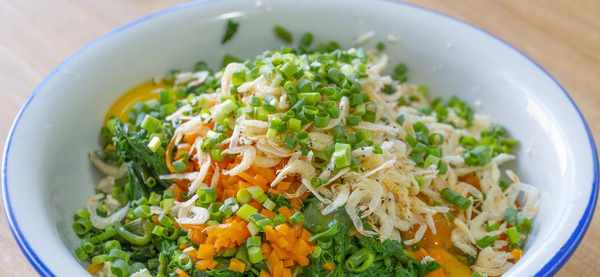 食材清单:豆腐、胡萝卜、空心菜、鸡蛋、虾皮、葱花、面粉