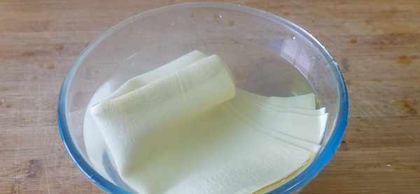 1、先准备2块豆腐皮,用开水泡5分钟,去除豆腥味;