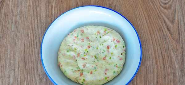 食材:青椒、火腿、300克面粉、180毫升开水、20克食用油、4克盐