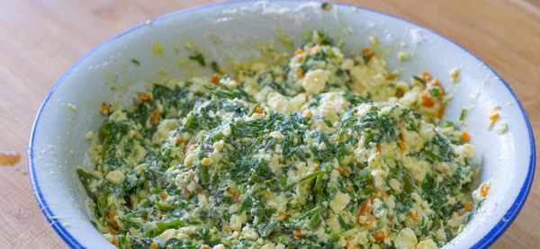 7、然后把空心菜、胡萝卜都倒进来,再打入两个鸡蛋,加一把虾皮、一把葱花、一勺面粉,接着加盐、五香粉、鸡精、香油调味儿。