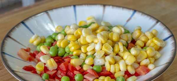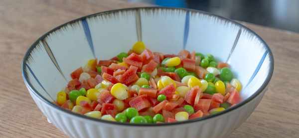 3、接着起锅烧水,水开加一勺盐和两滴油,然后把胡萝卜、玉米粒和青豆一起倒进来焯水,一分钟后捞出来先放到一旁备用。;