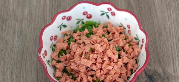 1、先来配菜:青椒、火腿分别切成小丁,颗粒越小越好,