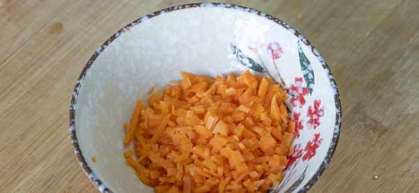 4、起锅烧水,加一勺盐和一勺油,水开后倒入胡萝卜丁焯水,30秒后捞出来控干水分备用。