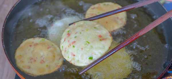 4、前面我们有提到青椒和火腿切得越小越好,如果你的颗粒比较大 ,也是会扎破这个小饼的表皮的,这也是鼓不起来大泡的一个原因,炸至两面金黄就可以出锅了,这个小油饼是不是特别简单呢?