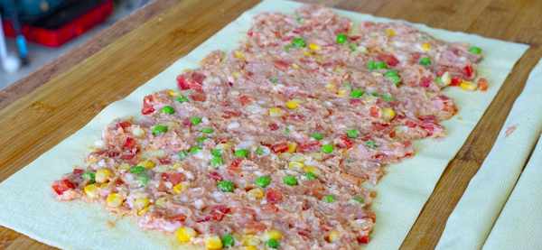 6、接着我们取出豆腐皮,沥干水分后铺在砧板上,把拌好的猪肉均匀地铺上去;