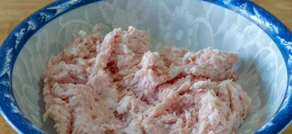 4、接着准备500克猪肉,肥瘦错换分的口感好一些,可以用前腿肉或者后腿肉,洗净后切成小块儿,然后加一小块儿生姜一起打成肉泥,打好后先倒入大碗里,再把焯水过的蔬菜也都加进来;