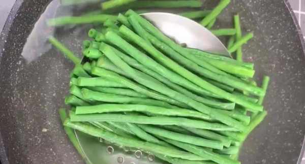 1.取新鲜豇豆一把,将豇豆去筋洗净切成段。起锅烧水,放入少许油盐,放入豇豆焯烫煮熟,捞出沥干水分备用。