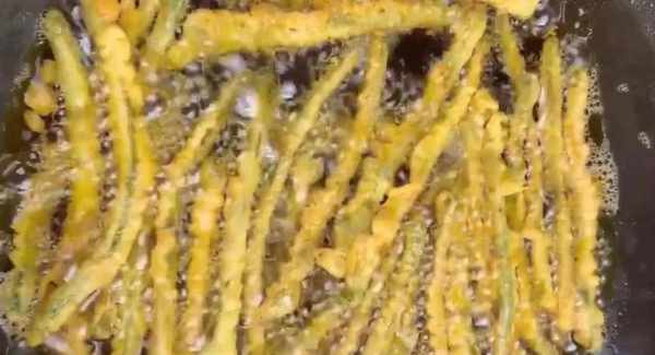 2.取面粉、鸡蛋打散,加入适量清水,搅打至无干粉的状态。锅热油烧至8成热,放入裹好面糊的豇豆,炸至表面外皮酥脆。