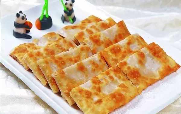 取出面团擀成薄饼状,倒入做好的糕点,摊平。撒上一层干面粉,擀在一起切块,把两端对折在一起,擀成长条形的蛋糕模。锅中油烧热,将饼干放入烤至两面金黄,取出摆盘。