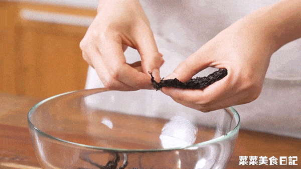 3.头水紫菜撕碎,加入1大勺橄榄油、1大勺熟芝麻、1小勺盐、1/2小勺糖拌匀