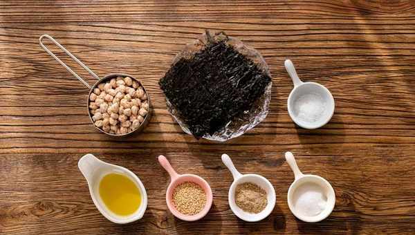 干鹰嘴豆100g 头水紫菜10g 孜然烧烤粉2小勺 盐2小勺 糖1小勺 熟芝麻1大勺 橄榄油2大勺