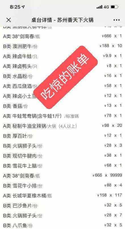 知道是群里搞的恶作剧后,吴女士就在群里不太友好地怼了几句恶作者,结果,这一下对方不仅没有收敛,反而更加疯狂的点起菜来,而且是专门照贵的点,牛油锅底竟然点了20份、188元一盘的澳洲肥牛也点了10份、52度的剑南春就给点了多达222瓶,还有其他昂贵的菜品等等,以每分钟几万的速度不断添加,结果。当吴女士及朋友们感觉到实在不对劲时,一算账,竟然已经点了474万的菜品和酒水。