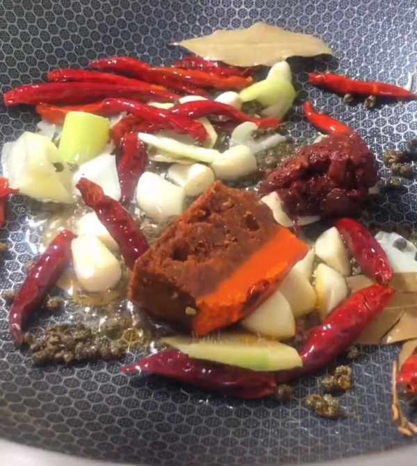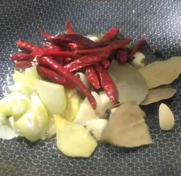 3.另起锅放少许底油,放入葱姜蒜煸炒至金黄色,然后放入香料辣椒继续煸炒至出香味。