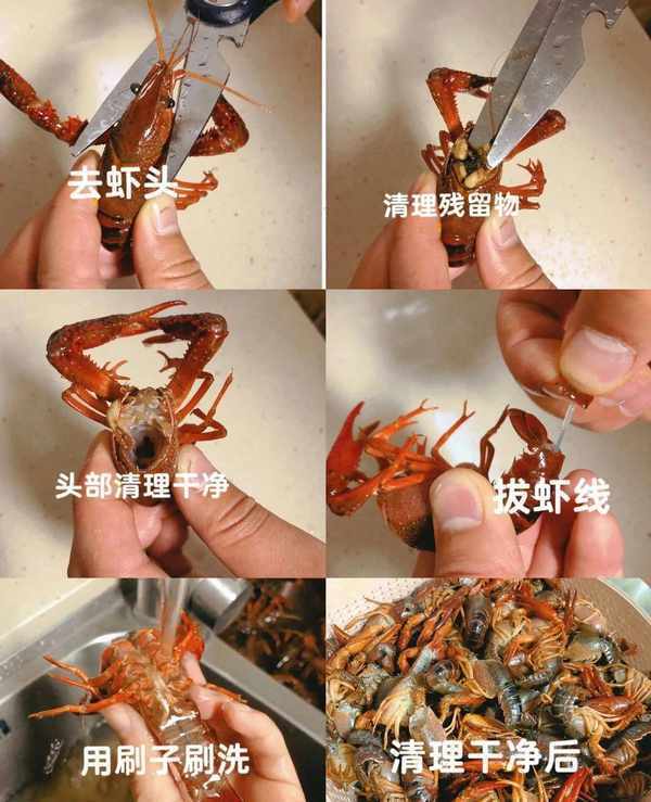 1.小龙虾选用活的,买回来用刷子去除背部和腹部污渍,洗干净后用剪刀去除头部,从尾部拔掉虾线,然后用水清洗干净。(注意别被虾钳夹到手了)