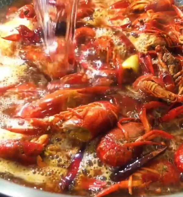 6.倒入啤酒,放生抽,蚝油,盐调味。然后倒入没过小龙虾的清水。