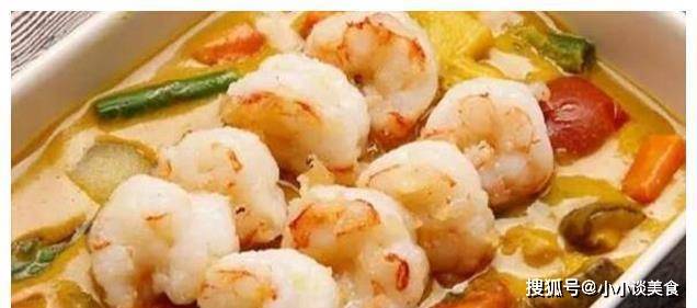 材料:虾仁100克,胡萝卜50克,土豆50克,蘑菇秸秆30克,盐5克,洋葱30克,芹菜30克,糖5克,椰子20克,芦笋30克,月桂叶5克,咖喱粉20克,牛油20克。