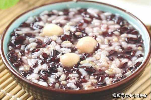 3、锅中加入足量的水。煮沸时加入紫米、大米和糙米。当水再次沸腾时,将其转为小火。煮约45分钟,直到谷物变软变软。加入莲子,继续煮10分钟后关火。