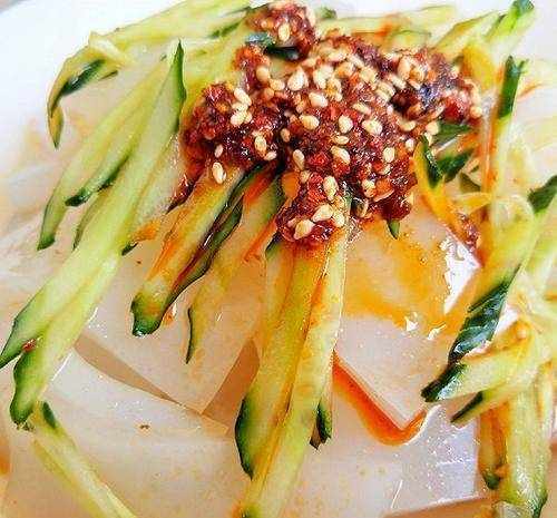 2.大蒜压成泥,黄瓜压碎堆在凉粉上面;